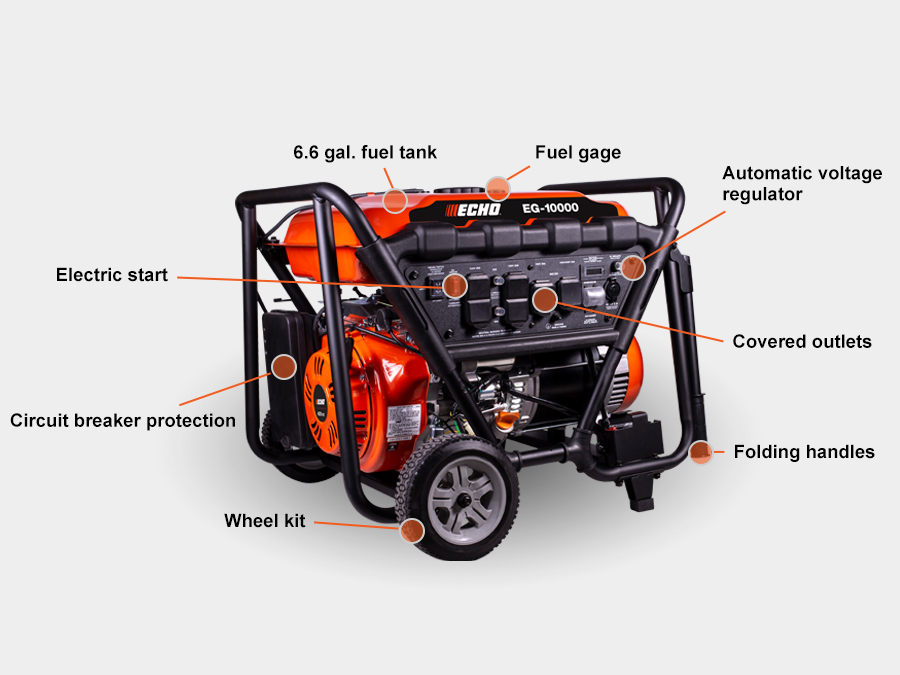 Major output for major needs. The EG-10000 generator runs quietly and is capable of efficiently producing 10,000 watts, enough to power large loads like jobsites, multiple home appliances and food trucks. An automatic voltage regulator also maintains constant power.