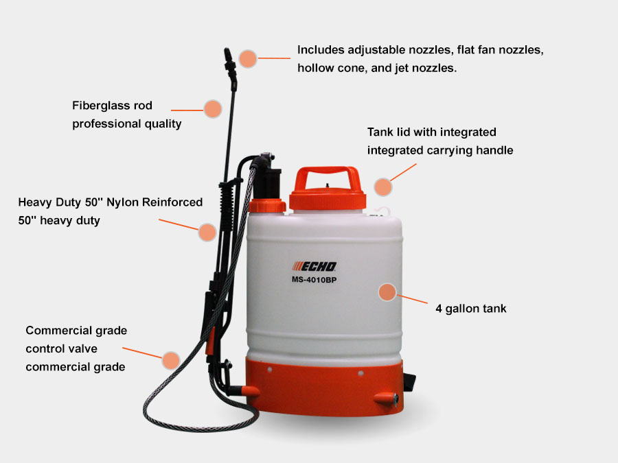 The ECHO MS-4010BP Backpack Manual Sprayer offers a piston pump that makes pressurization fast and easy reducing user fatigue. It features a 4-gallon premium quality, professional-grade tank, and 50 in. heavy-duty, nylon-reinforced hose. Ideal for use in either turf or agricultural applications.